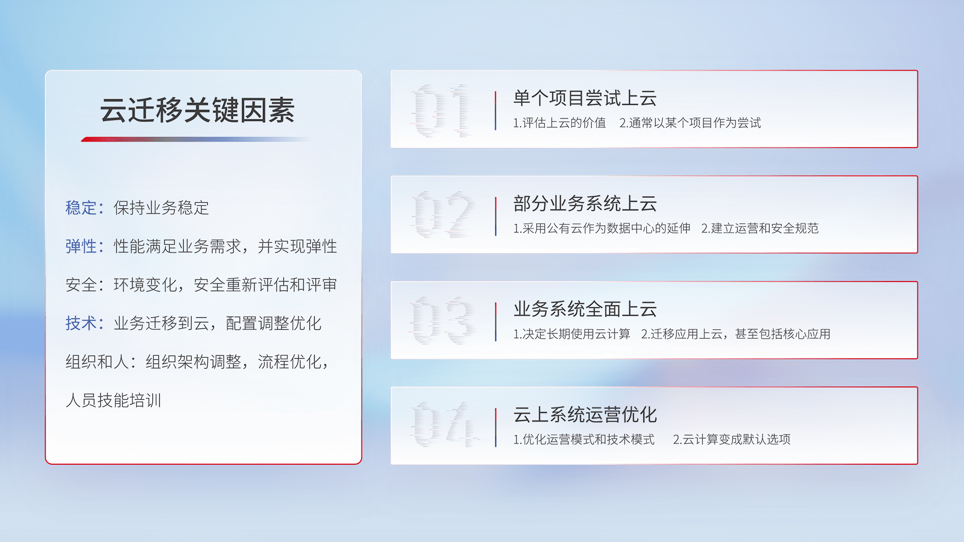 结合实际业务,,从规划设计、、、云平台选型、、、、云原生改造、、、、数据迁移、、集成交付,,迁移全过程为客户识别最佳上云路径,,,,做好风险识别管理,,设计网络架构、、、、身份权限、、、安全审计合规、、、操作审计、、、日志审计、、、、监控告警策略、、、、多站点容灾设计等,,对云上基础设施进行整体规划,,,,提升IT治理水平,,,以满足弹性、、、、高可用、、、高性能的需求。。